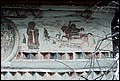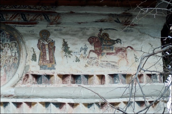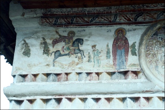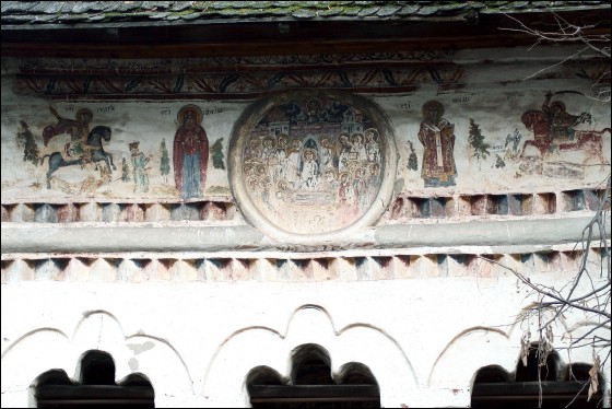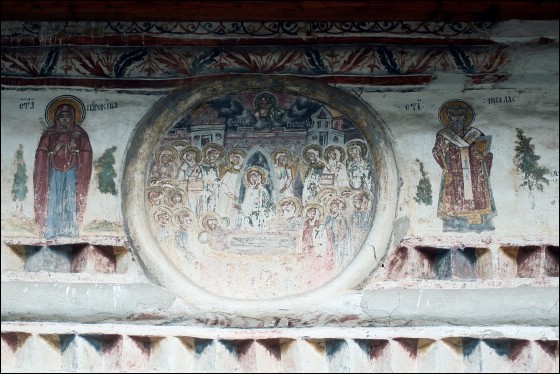 Biserica "Adormirea Maicii Domnului" din cimitir a fost ctitorită la 1786. Pictura exterioară cuprinde numai pridvorul și a fost realizată după 1824. Calitatea picturii existente în prezent pare să indice că mai de mult (în urmă cu 40 de ani ?) au fost repictate atât frescele existente la exteriorul pridvorului, precum și cele din interiorul acestuia. Din păcate, biserica, la sfârșitul anului 2008 se afla într-o stare avansată de degradare. |