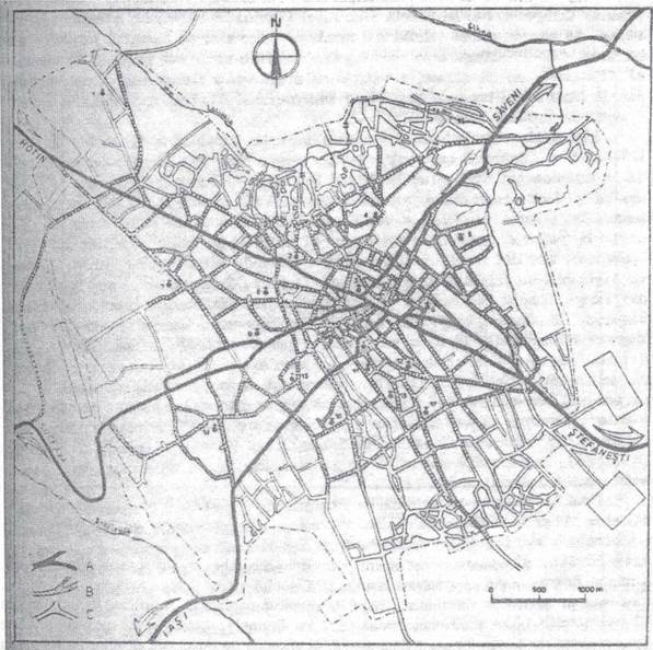 Fig. 6. Analiza reţelei de străzi īn vatra Botoşanilor: A. drumuri de tranzit medievale; B. Reţea de uliţe databilă īn sec. XIV-XVIII; C. străzi existente īn 1899. 1. bis. Sf. Nicolae-Poăuţi; 2. bis. Sf. Ilie; 3. bis. Uspenia; 4. bis. Duminica Mare; 5, bis. lipovenească; 6.bis. Sf. Spiridon; 7. bis. Roset ;8. bis. Sf. Paraschiva; 9. bis. Sf. Spiridon; 10. bis. Sf. Gheorghe; 11. bis. armenească Adormirea Maicii Domnului; 12. bis. Sf-ţii Voievozi; 13. bis. armenească Sf. Treime; 14. bis. Trei Ierarhi; 15. bis. Vovidenia; 16. bis. Sf. loan; 17 bis. Sf. Nicolae. Primăriei (Karl Marx) şi Sf. Ilie (Independenţei), către direcţia Dorohoi dată de Calea Naţională; străzile Hrisoverghi (Alba Iulia) şi Peneş Curcanul, către direcţia Săveni dată de strada Roşiorilor (Săveni); Ion Brătianu (Tudor Vladimirescu) şi Victoriei, către direcţia Ştefaneşti dată de străzile Vānătorilor (Dobrogeanu-Gherea) şi Dragoş Vodă. O confluenţă tot atāt de clară a uliţelor ne indică vechiul traseu spre Suceava, cu ieşire din oraş, la 1899, la biserica Agafton: īntālnirea străzilor Mavroasa (Pictor Grigorescu) şi Horia- Cerbului (Transilvania) cu strada Marchian, la traversarea pārāului Cacaina şi corelarea acestui punct cu bariera Agafton, lāngă care s-au găsit urmele unui sat părăsit īn veacul al XIV-lea6, ne dă direcţia vechiului drum spre Suceava, care urmărea īn linii mari traseul străzilor Marchian - Sf. Dumitru (Maxim Gorki)- Agafton (Mihail Eminescu).