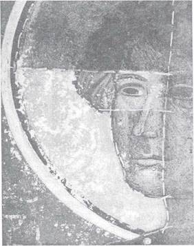 Foto 3. Naos, absida sudică, semicalota cu scena īnălţarea" - detaliu Isus īn slavă, imagine după curăţirea picturii