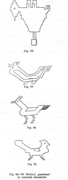 În categoria scoarţelor cu decor vegetal, un loc însemnat, alături de scoarţele cu pomul vieţii şi vasul cu flori îl au şi scoarţele în câmpul ornamental al cărora apar motive florale stilizate, dispuse simetric sau asimetric într-o ordine riguroasă (cat. 4652, pl. 43). în acest caz, motivele sunt dispuse aerat, având între ele spaţii largi, în care fondul este folosit astfel încât să pună în valoare motivele care capătă o individualitate proprie, prezentându-le izolat, fără artificii supărătoare. O altă categorie des întâlnită în zona cercetată o constituie scoarţele cu decor geometric şi vegetal. In câmpul ornamental al acestor scoarţe se întâlnesc motive florale stilizate, dispuse în registre paralele cu motive geometrice (cat. 53, pl. 44). Asocierea acestor motive se realizează cu uşurinţă, în mod firesc, compoziţia păstrând o notă de claritate, de echilibru şi de armonie. Din categoria scoarţelor cu decor figurat, fac parte scoarţele ce au în compoziţia lor ornamentală motive zoomorfe, avimorfe şi antropomorfe. Aceste scoarţe au o frecvenţă mai redusă în zona cercetată. Dintre motivele avimorfe, cel mai adeseori apare pasărea în mai multe variante (cat. 54, pl. 45, cat. 55, pl. 46, fig. 62-70. Pasărea intră de obicei în compoziţia scoarţelor cu pomul vieţii ocupând un loc izolat, secundar. în diverse alte variante, pasărea apare şi în scoarţele cu decorul împărţit în pătrate ocupând de data aceasta un loc însemnat.