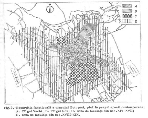 La Botoşani, inima târgului este alcătuită din două nuclee principale: Târgul Vechi sau Târgul de Sus şi Târgul Nou - care include şi Târgul de Jos - despărţite prin Calea Naţională (porţiunea între str. Ruset (I.C. Frimu) şi Peneş Curcanul, continuată cu str. Vânătorilor), care a purtat numele de drumul Hotinului10.(fig. 9). Dezvoltarea Târgului Nou, limitat până după 1850 la zona străzii Sf. Ilie(Independenţei) şi a racordării cu Târgul de Jos - Târgul vitelor (respectiv străzile Dumbrava Roşie(Griviţei) şi Tineretului spre sud-vest şi Peneş Curcanul spre sud-est) (fig. 10) este atestată documentar în prima jumătate a veacului al XVIII-lea: documentul emis de Constantin Mavrocordat la 22 iunie 1745, privind hotărnicirea locurilor stăpânite de târgoveţi în Târgul de Sus11 , implică prin denumire existenţa unui al doilea Târg, cel de jos, pe care îl considerăm identic cu Târgul Vitelor, amplasat din punctul de vedere al reliefului mai jos decât centrul Târgului Vechi-de sus. Totuşi, întrucât este posibil ca Târgul de Jos să fi reprezentat din vechime locul iarmarocului periodic, considerăm mai concludent pentru închegarea Târgului Nou documentul din 4 mai 1776, emis de Grigore Ghica pentru reglementarea funcţionării târgului de vite, denumit şi Târgul boilor. aflăm că terenul rezervat oborului de vite,...loc slobod, carele dintru început au fost numit pentru adunare oamenilor ci să strâng la zi de târg, ţiindu-şi vitele ce avč de vânzare pe acel loc, a început să fie invadat de curţile târgoveţilor,
