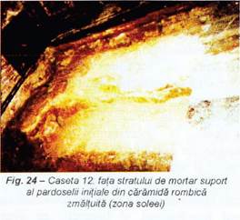 În altar a apărut apoi foarte clar nivelul de montare a pardoselii originare, alcătuit din mortar de var/nisip, bine păstrat, cu rosturile dintre fostele elemente pavimentare perfect vizibile -fig. 23. Faptul că traseul acestor rosturi s-a mai păstrat in situ pe suprafeţe apreciabile, ca şi faptul că unele dintre cărămizile rombice zmălţuie - piese întregi sau fragmentare - au rămas pe loc, acolo unde fuseseră de la început aşezate, de exemplu, sub masa diaconiconului sau lângă piciorul mesei altarului, ne demonstrează clar că