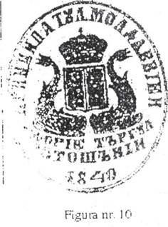 Eforia foloseşte, după cum s-a văzut mai sus, al doilea sigiliu confecţionat în 1832 de Sfatul Municipal, probabil 117până în anul 1835, cu toate că, în urma hotărârii din 4 septembrie 1834 a domnitorului Mihail Sturza de a se schimba sigiliile instituţiilor potrivit cu noua stemă domnească118 în care intra şi leul - blazonul familiei sale - primul sigiliu al Eforiei poartă data 1834. Amprenta acestuia, în negru-fum, găsită într-un dosar119 din anul 1836, în conformitate cu hotărârea domnească, prezintă următoarele caracteristici: formă ovală cu diametrul 33/37 mm, în câmpul sigiliului se află un scut despicat: la dextra se află emblema statului - capul de zimbru cu stea între coarne iar la senestra blazonul familiei Sturza - leul ridicat în picioare; scutul timbrat de o coroană princiară închisă, cu crucea deasupra, este susţinut de cei doi peşti ca în sigiliul anterior; de jur în jur, în două semicercuri, este scrisă legenda sus: PRINŢIPATUL MOLDOVEI 1834, iar jos: EFORIA BOTOŞANII; totul este mărginit de un cerc liniar îngust urmat de un altul mai lat (fig. 9). Sigiliul confecţionat în 1835 (datat 1834) a fost folosit până în anul 1840, când se introduce un altul nou a cărui amprentă, în ceară roşie, găsită la încheierea unui 120dosar al Eforiei din anul 1842, prezintă aceleaşi elemente ca primul, cu unele mici deosebiri: este mai oval (diametrul 30/38 mm), iar legenda este scrisă astfel: în semicercul de sus: PRINŢIPATUL MOLDOVEI, iar în cel de jos, pe trei rânduri de astă dată, sub cei doi peşti: EFORIE TÂRGUL BOTOŞANII - 1840. Puţin lizibilă pe dosarul citat - din cauză că ceara este sfărâmată în unele locuri - amprenta aceluiaşi sigiliu se află imprimată în negru-fum, ceva mai clar, şi pe un document121 din 16 martie 1848 (fig. 10). Schimbarea domnitorului Mihail Sturza în 1849 a determinat şi schimbarea sigiliilor tuturor instituţiilor, deci şi al Eforiei oraşului Botoşani Noul sigiliu conţine aceleaşi elemente ca cel anterior, cu următoarele deosebiri: capul de zimbru cu stea între coarne, coroana princiară este închisă, dar formată din mai multe braţe, şi lipită de scut; cozile peştilor au poziţii verticale, iar legenda dispusă în acelaşi mod este: în semicercul de sus: „PRINŢIPATUL MOLDOVEI", şi jos „EFORIA TÂRGUL - BOTOŞANII - 1849", Sigiliul este tot oval, dar cu diametrul de 34/40 mm (fig. 11). În conformitate cu hotărârea anaforalei Sfatului Administrativ Extraordinar al Moldovei din 23 ianuarie 1851 prin care „s-au prefăcut numirea de Eforie în acel de Sfat orăşenesc122, şi la Botoşani Eforia îşi schimbă denumirea. Totuşi Sfatul orăşenesc din Botoşani nu-şi confecţionează un sigiliu în care să apară această nouă denumire, ci foloseşte în continuare acelaşi sigiliu din 1849 al Eforiei, aşa după cum reiese dintr-un document din 14 septembrie 1853 şi dintr-un altul din 7 martie 18 5 8123, întărite prin aplicarea lui în tuş verde. Din lipsa materialului documentar sau ilustrativ nu ştim dacă imediat după Unirea Principatelor conducerea oraşului Botoşani şi-a confecţionat un nou sigiliu care să ilustreze evenimentul şi noua situaţie a ţării. Cert este că în anul 1862, în conformitate cu sugestia Ministerului de Interne ca sigiliile municipalităţilor de oraşe şi târguri să fie modificate punându- se pe fiecare marca ţinutului respectiv124 oraşul Botoşani are un nou sigiliu. Amprenta lui, în tuş negru, aflată într-un dosar referitor la organizarea dorobanţilor , este rotundă, cu diametrul de 39 mm; în mijloc se află emblema ţinutului: o casă cu coada înfiptă vertical într-un lan, coasa propriu-zisă fiind cu vârful înspre senestra (iarăşi o poziţie nefirească, aşa cum era şi cea din 1832); dedesubtul lanului este trecut anul confecţionării: 1862; de jur în jur este scrisă legenda: MUNICIPALITATEA ORAŞULUI BOTOŞANI (fig. 12). Casa va apare de acum înainte şi ca emblemă a oraşului Botoşani, nu numai a judeţului, în toate sigiliile confecţionate de conducerea sa, modificări survenind doar în legendă în momentele schimbării denumirii statului sau a organului administrativ orăşenesc: România, Regatul României, Municipalitatea, Primăria comunei urbane, Primăria oraşului etc