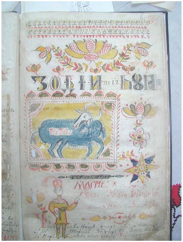 Întrebări şi răspunsuri din sfânta Evanghelie; Tipicul slujbei; Cazanii la oamini morţi; Trei împărăţii pre pământ, în locul sf. Troiţă; Ceasurile cele bune şi cele rele ; 12 vise a< le> lui Şaică împărat – text neterminat. Numele copistului (ieromonahul Gherman) şi anul sunt cuprinse într-o însemnare slavonă. Unul din Miscelaneele teologice conţine texte copiate din cărţi imprimate,indicate de copist, sau „de pe o coală tipărită adusă de la Mănăstire Neamţului”, copistul fiind paharnicul Gh. M. Herescu din Botoşani.Alte două Miscelanee sunt creaţiile unor elevi, unii veniţi din Transilvania, “când am învăţat la glasuri în sat, în Negreşti, la dascalu Niculăiţă, în ţinutul Neamţului” ori, în alt caz, „s-a scris în şcoala Şerbeştilor ot ţinutul Pietrii”. Miscelaneele de literatură monahală conţin capete, cuvinte ale sfinţilor Efrem Sirul, Macarie Egipteanul, Filotei, Nil pustnicul, Nichifor – cel din singurătate, Simeon – noul cuvântător de Dumnezeu, Marco pustnicul, Grigore Sinaitul, Ioan Scărarul. Unul dintre ele, este posibil să fi aparţinut lui Paisie Velicikovski. Cele cinci Miscelanee de literatură populară adună texte apocrife (Minunile Maicii Domnului, Minunea Sf. Sisoe, Epistolie, Verşul întăi a lui Adam), cronografe, cărţi de prevestire (Zodiac, Gromovnic, Tâlcuirea viselor, Trepetnic), romane orientale (Sindipa, Istoria lui Skinder), romane populare (Archirie şi Anadan), reţete medicale. Două Miscelanee de literatură populară atrag atenţia prin miniaturile şi elementele de ornamentică bogate; primul, datat după anul 1805 (fig. 1-5), reprezintă zodiile, unele pe foi întregi, iniţiale ornate şi vignete policrome, din motive vegetale,zoomorfe şi antropomorfe (inv. 64). NOTE 1. Vezi şi Olimpia Mitric, Manuscrise româneşti în colecţii botoşănene (secolele XVII-XX)-prezentare generală-, în „Revista română de istorie a cărţii”, Anul I, Numărul 1, Bucureşti, 2004, p. 72-77. 2.Herodot, Traducere românească publicată după manuscriptul găsit la Mănăstirea Coşula <astăzi, la BAR, cota ms. rom. 3499>, de N. Iorga, Vălenii de Munte, 1909; Cf. şi Herodot, Istorii, Ediţie îngrijită de Liviu Onu şi Lucia Şapcaliu (…), Editura Minerva, Bucureşti, 1984; N. Iorga, Pomelnicul Mănăstirii Popăuţi, în Studii şi documente, vol. V (1903 ),p.209-230; Idem, Biblioteca Mănăstirii Vorona. Manuscripte, în Studii şi documente, vol. XVI, Bucureşti, 1909,p.274-277, semnalează manuscrisele,care, cu o excepţie, astăzi, nu se mai găsesc aici: Miscelaneu, Floarea darurilor (sec. XVIII), Mărturii doveditoare de la dreptul Sith… (azi, la DJAN –