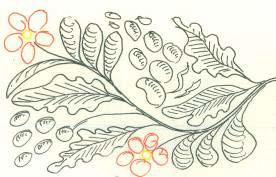 Fig. 27 Bonzile purtate în zilele de sărbătoare erau uneori ornamentate cu motive geometrice sau florale stilizate, cusute cu lână cumpărată de la oraş, strămătura. (Pl. 37, 38), (Fig. 24-28). Mai recent ornamentele au început să fie cusute cu mătase şi aţă colorată, iar motivele florale predomină. Sumanele (sumăielele) au fost
