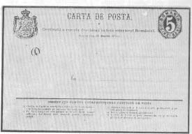 Fig. 1 Aceasta a apărut în Austria – Ungaria, la 01.11.1869, urmare a necesităţilor de comunicare şi a iniţiativei prof. EMANUEL HERRMANN de la Academia Militară din Viena. Utilitatea şi eficienţa cărţilor poştale a făcut ca la sfârşitul anului 1880 întrebuinţarea acestui mijloc de comunicare să fie generalizat în toate ţările afiliate la U.P.U.1, contrar faptului că abia la 01.10.1907, în cadrul Congresului Internaţional al Poştelor, desfăşurat la Roma, se reglementează utilizarea cărţilor poştale. Conform prevederilor Convenţiei Poştale Universale, au fost stabilite caracteristicile tehnice ce se impuneau cărţii poştale, privind gabaritul (cu toleranţele + - admise), calitatea cartonului, culoarea, încât pe măsura folosirii lor, au căpătat diferite destinaţii şi în acelaşi timp cunoscând o mare diversitate (simple, cu răspuns plătit3, semiilustrate, ilustrate (vederi), tip felicitare, de binefacere, militare (scutite de taxă), de serviciu (folosite de administraţiile poştale şi anumite instituţii), jubiliare, de ocupaţie, comemorative, pentru strângerea de fonduri (cu suprataxă), pentru corespondenţa prizonierilor de război etc.). În România, cărţile poştale au fost introduse la 1/13.06.1873, în baza Legii pentru cărţile poştale de poştă, promulgată cu decretul nr. 789/31.03.1873 şi a Regulamentului de aplicare a acestei legi, aprobat prin Decretul nr. 945/27.04.1873. Primele cărţi poştale româneşti aveau dimensiunile de 88x140 mm, erau confecţionate din carton alb, de calitate inferioară, fiind imprimate cu o marcă fixă de 5 bani de culoare albastră (întreg poştal), stema ţării şi titulatura „CARTA DE POŞTĂ” (fig.1). Vorbind de prima carte poştală ilustrată (c.p.i.) din ţară noastră în ultimul