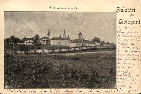 C.P.I. circulată din Botoşani (28.04.1900) la Tg. Ocna (29.04.1900). În prim plan, şcoala construită de Marchian Folescu. Este de presupus că la Mănăstirea Coşula (fig.7) această trimitere poştală oficială a fost primită de către arhimandritul care a slujit ca superior după stăreţia lui MARCHIAN FOLESCU (1854-1864) ?. Din alte surse7 luăm informaţia că între 1861-1867, la Mănăstirea Coşula a fost Mitropoliei Moldovei în 1866 şi adresa de numire la 31 decembrie 1867 ca stareţ la 38 GHERASIM MÂRZESCU în locul lui VENIAMIN ZAGAVIANU, decedat. Cât priveşte Mănăstirea Coşula, ctitoria vistiernicului MATEIAŞ COŞULVEI, datată din 1535, aceasta a ajuns la apogeul prosperităţii în timpul stăreţiei arhiereului MARCHIAN FOLESCU (1815-1861), ce s-a aflat în mare demnitate de a conduce acest lăcaş între anii 1854-1864 ?? Urmare a prosperităţii economice, dar şi a cerinţelor specifice acestor lăcaşuri