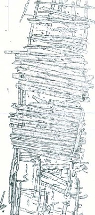 Fig. 3.Fragment din capătul nord-vestic al podului II Cele două poduri flotante din care s-au dezvelit mai multe fragmente s-au scufundat în turbă cu o diferenţă de nivel de grosimi variate şi de pământ steril de diferite provenienţe. Astfel, porţiunea din podul I ce se sprijinea pe malul stâng al mlaştinii, dezvelită prin săpăturile din 1977, avea aspectul unei podine uniforme realizată prin îmbinarea perfectă a bârnelor despicate suprapuse peste altele rotunde, astfel încât asigurau o mare stabilitate acestei porţiuni care era mai mult solicitată în condiţiile unui astfel de pod elastic. În acest loc podul I avea o grosime de 0,55 m şi era format din patru depuneri de bârne, primele două cioplite, a treia formată din trunchiuri de secţiune rotundă, iar ultima depunere era formată tot din trunchiuri dispuse longitudinal pe un strat neuniform de fascini.