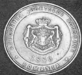 Fig. 2b A doua medalie (anticipată): Pe avers, efigia Regeului Carol I (cu barba unică) în profil spre stânga (central). Inscripţia circulară „CAROL I REGE AL ROMÂNIEI”. Pe revers, central – stema judeţului Botoşani - coasa, cu cosia înfiptă în pământ, legenda pe două rânduri: „ONOARE CULTIVATORULUI”, sub care milesinul 1880, încadrate de inscripţia circulară: CONCURS DE AGRICULTURĂ ÎN DISTRICTUL BOTOŞANI. Întreaga compoziţie a reversului cuprinsă circular de cununa alegorică la