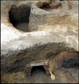 funcţionare care ar trebui să fie cea a primei jumătăţi a secolului al XVI-lea. Surprinzător a Foto 13 rămas însă faptul că, aproximativ în aceeaşi locaţie, au fost descoperite încă trei cuptoare, mult mai mari ca diametru şi ca atare mult mai mari în materie de capacitate volumetrică, toate databile fiind în secolul al XV-lea. Spre deosebire de cele ulterioare, acestea sunt de formă cert tronconică, în faţa fiecăruia existând câte o groapă de formă neregulată, săpată de la nivelul de călcare din vechime al locului. Toate cele trei cuptoare – c2, c4, c5 – (fig. 1 bis), au avut un orificiu de dare a focului construit/amenajat din cărămidă cu încercarea vizibilă de a se obţine un spaţiu boltit, realizare mai mult sau mai puţin reuşită9. Din punct de vedere cronologic, este clară datarea acestor cuptoare în secolul al XV-
