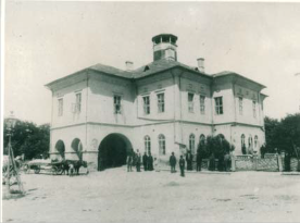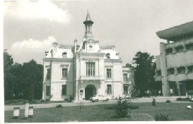 Fig. 93. Casa Codrescu – Başotă (primăria veche). Imagine din Al. Antoniu, Albumul general al României, Bucureşti, 1893 născut în Botoşani, a cumpărat casa Codrescu şi a dăruit-o oraşului, „din îndemnul aceiaşi dorinţe de a vedea înmulţirea aşezămintelor publice, nu mai puţin şi a simţirii care ne trage gândirea către acel oraş unde au fost leagănul prunciei noastre...”. Vechea casă, cu arhitectură specifică marilor conace boiereşti, a fost adaptată programului de primărie, primind şi o decoraţie exterioară romantică (rezalituri de colţ cu secţiune poligonală, friză cu arcaturi lombarde etc.) care nu a afectat structura originară (fig. Fig. 94. Actuala primărie a municipiului, care ar putea păstra părţi din vechea primărie