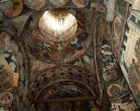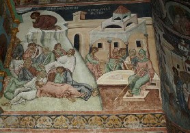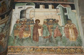 Registrul II al picturii, privind de jos în sus, Friza patimilor, naos, peretele sudic, zona între absida sudică şi iconostasul altarului Aspectele semnificative ale „istoriei” bisericii sunt cele două intervenţii importante, cu afectarea sistemului structural al construcţiei (pe lângă altele care au vizat, spre exemplu, pictura: spălarea frescelor din 1927). O primă intervenţie care a marcat ireversibil monumentul, cu pierderea unei importante cantităţi de materie originară şi documente iconografice inestimabile (tabloul votiv