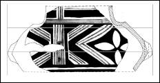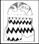 Modelat din pastă fină, ars oxidant. Are corpul bombat spre bază, gâtul uşor tronconic, o tortiţă laterală străpunsă orizontal la baza gâtului, fundul slab conturat. Decorul se desfăşoară pe două registre orizontale, delimitate de benzi circulare albe, rezervate din fondul vasului. Motivele decorative pe gât sunt pictate cu roşu pe fond alb, interspaţiile pictate cu negru.Registrul acesta este impărţit in două metope decorate identic cu romburi realizate din benzi liniare ce ocrotesc interior două arcuri aşezate opus. Corpul vasului e pictat bicrom cu negru pe fond alb, cu motive spiralice, cu volute răsucite, şters in cea mai mare parte. 5. Pahar (fragmentar) I: 9,5; D.G.: 10 cm; D.B.: 5 cm Inv. 1703