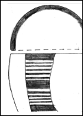 Modelat îngrijit din pastă fină,consistent, bine ars. Are gâtul aproape drept, corpul bombat. Pe fondul alb al vasului s-au pictat succesiv benzi negre late şi benzi liniare roşii. Pe buză in interior e pictat cu alb, iar marginea cu negru. 8. Pahar fragmentar I: 10 cm; D.G.: 8 cm Inv. l599 Modelat din pastă foarte fină, ars oxidant. Are buza adusă uşor spre interior, gâtul aproape drept, corpul bombat, fundul mic şi slab conturat. Registrele tectonice sunt delimitate printr-o bandă circulară albă, rezervată cu roşu din fond. Este ornamentat cu ghirlande de benzi liniare roşii pe inveliş alb, in două registre: unul pe gât şi unul pe partea dezvoltată a vasului. In interior e pictat in întregime cu alb, iar pe marginea buzei cu roşu.