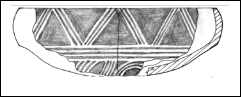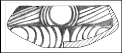 Lucrat din pastă fină , ars oxidant. Fragment dintr-un pahar cu gâtul aproape drept si corp bombat. S-a pictat pe fondul alb al vasului motivul in zig-zag în benzi orizontale ce imbracă vasul de jur împrejur. Zig-zagul pictat cu negru-brun este realizat prin juxtapunerea a două zig-zaguri. Intre liniile frânte ale zig-zagului s-a pictat cu roşu, rezultând în final un spaţiu de fond alb cu laturile în dinţi de fierăstrău, ceea ce duce la o dublare a motivului. Pe buză, exterior, apar mici liniuţe ce sugerează continuarea motivelor decorative, infinitul. Interior sunt pictate cu roşu motive arcuite, benzi liniare. 7. Pahar fragmentar I: 9 cm; D.G.: 8 cm Inv. 1709