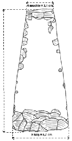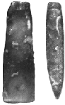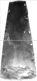 1 ignatioan1981@gmail.com 2 Căruia îi mulţumim pe această cale pentru amabilitatea de a ne fi pus piesele la dispoziţie. repertoriului, în colecţia Şcolii cu clasele I-VIII, Lozna3. Ambele topoare sunt lucrate din silex, primul având o culoare majoritară cenuşie mai deschisă, pe una din feţe având şi o porţiune de nuanţă vineţie, iar celălalt fiind de culoare cenuşiu-vineţie mai închisă, cu mici pete albicioase. Având în vedere această culoare a materiei prime, se pare că suntem în faţa unor piese lucrate din silex de Prut. Primul dintre topoare poate fi încadrat în categoria pieselor cu secţiunea longitudinală trapezoidală, cu baza mică la muchie şi cea mare în zona tăişului. Secţiunea transversală este rectangulară, părţile laterale sunt aproximativ drepte, iar tăişul foarte uşor curbat prezintă câteva ciobituri, semnalate, de altfel, pe aproape întreaga
