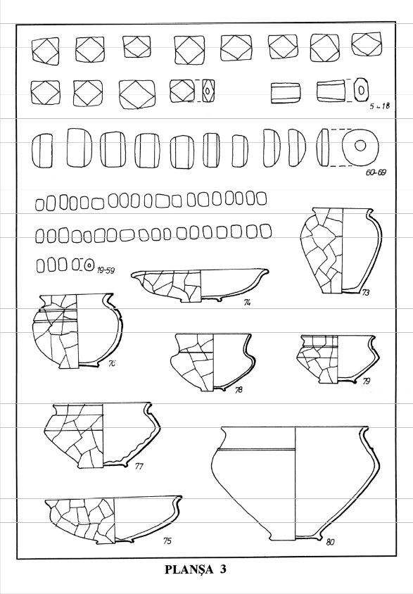 Lucrată din pastă semifină cu cioburi pisate în compoziţie, ars oxidant, însă incomplet pentru că miezul este cenuşiu. Umărul este uşor arcuit, buza înclinată în afară, fundul slab conturat. Pe umăr are o proeminenţă străpunsă orizontal. E pictat bicrom pe ambele feţe cu roşu pe fond alb. Exterior, pe buza vasului, motivul ornamental e realizat cu ajutorul benzilor liniare înguste şi late, verticale si piezişe ce-i dau vivacitate şi în acelaşi timp un aspect metopic. Fundul vasului prezintă benzi circulare. Interior, pe fragmentul păstrat, se văd benzi liniare piezişe, pictate si rezervate. 6. Vas cu umăr rotund I:19 cm; D.G.: 28 cm Inv. 1679 Modelat din pastă fină, ars oxidant, uniform. S-a păstrat jumătate din vas. Acesta are gâtul scurt, buza răsfrântă în afară, corpul bombat, gura largă, umărul rotund, fundul puţin definit. Are o tortiţă laterală pe linia dintre gât si umăr străpunsă orizontal . Buza vasului e uşor lăţită iar pe jumătatea aceasta de vas păstrează două "ciocuri" trase exterior, cu rol ornamental (probabil au fost patru).Pe fondul alb al vasului s-a pictat cu roşu şi negru. Registrele tectonice orizontale sunt delimitate prin benzi circulare rezervate cu brun spre bază şi roşu deasupra umărului. Buza vasului e decorată cu scurte liniuţe roşii , trase pe lăţime. Registrul superior prezintă o friză compusă din perle albe cruţate cu negru- brun din inveliş, ornamentate cu scurte liniuţe verticale. Acestea sunt flancate de benzi arcuite, înguste, roşii. Intre aceste motive s-au tras benzi multiliniare, piezişe, roşii. Interspaţiul e pictat cu negru intins. Pe corp decorul e compus din motive spiralice liniare pictate cu roşu, legate tangent de benzi multiliniare rosii.