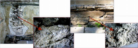 Foto 3 şi 4. Biserica Sfântul Gheorghe Voroneţ, soclu decroş nord-est, exterior, lacună unde zidăria cu pietre brute este vizibilă. Detaliu macro cu mortarul de legătură dintre pietre. Foto 5 şi 6. Biserica Sfântul Nicolae Popăuţi, soclu, baza faţadei sudice, zidăria cu pietre de diverse dimensiuni. Detaliu macro cu mortarul de legătură dintre pietre. Foto 7. Biserica Sfântul Nicolae Dorohoi, exterior, construită cu un an înaintea bisericii de la Popăuţi, absida estică cu paramentul de piatră brută (soclu decopertat la ultima restaurare de arhitectură); Foto 8. Detaliu macro de la Dorohoi cu mortarul ce umple rosturile dintre pietrele aflate în interiorul zidăriei - mortar de var şi nisip nesortat de râu; Foto 9. Biserica Bunavestire Moldoviţa, baza faţadei vestice, soclul unde pietrele profilului sunt marcate cu semne de meşteri şi banca.