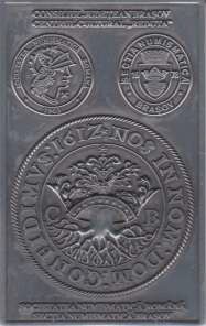 braşoveni cu Gabriel Bathory. Fig. 3 În câmpul central al monedei, stema (acelaşi model a fost utilizat şi pentru baterea monedelor din argint de 2 taleri, un taler şi un gulden, cu gramaje diferite (56,5 g; 28,7 g; 15,8 g) Braşovului încadrată de iniţialele C.-B. (Civitas Brassov) şi legenda circulară: NOS ÎN NOM : DOM : CONFIDIMUS – 1612 (referire la Psalm 20.8). Partea superioară a reversului este simetric ocupată de sigla S.N.R. (stânga) şi insigna Secţiei Numismatice Braşov (dreapta). Legenda reversului este dispusă simetric pe axa verticală: - superior: CONSILIUL JUDEŢEAN BRAŞOV / CENTRUL CULTURAL "REDUTA" - inferior: SOCIETATEA NUMISMATICĂ ROMÂNĂ / SECŢIA NUMISMATICĂ BRAŞOV Pe muchia laterală dreapta sunt redate în incizie iniţialele editorului Ş.S. şi adresa firmei care a realizat comanda în tiraj de 99 exemplare (www.accesoriiprod.ro). 8 Pe muchia inferioară este incizat numărul de ordine al exemplarului. Realizată din tombac argintat cu dimensiunile de 4 x 50 x 80 mm , a fost oferită celor în drept stabiliţi de organizatori într-o elegantă cutie din lemn, pluşată la interior, având gravată pe capac insigna Secţiei Braşov a S.N.R. şi titlul manifestării. Placheta este însoţită de un certificat de autenticitate.