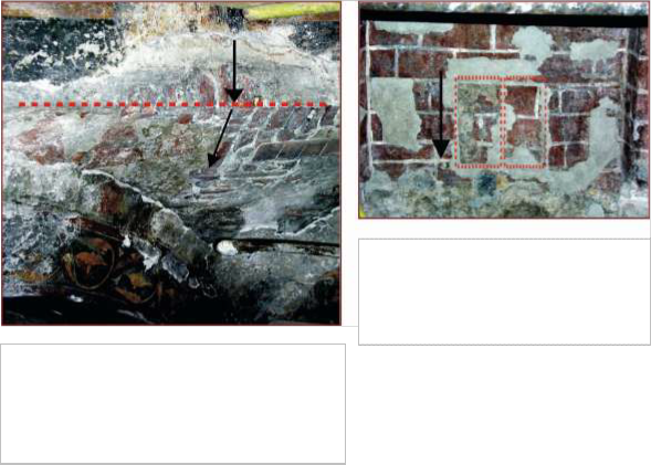 Foto 14. Biserica Sf. Nicolae Popăuţi, pronaos, baza calotei cu pandantivul nord-vestic şi o porţiune din arcul nordic unde s-a pierdut stratul de pictură şi parţial stratul primei decoraţii, ceea ce face posibilă observarea zidăriei de cărămidă atent realizată şi modul de finisare a rosturilor cu mortar de var ce indică acurateţe şi înaltă calitate tehnică. 39
