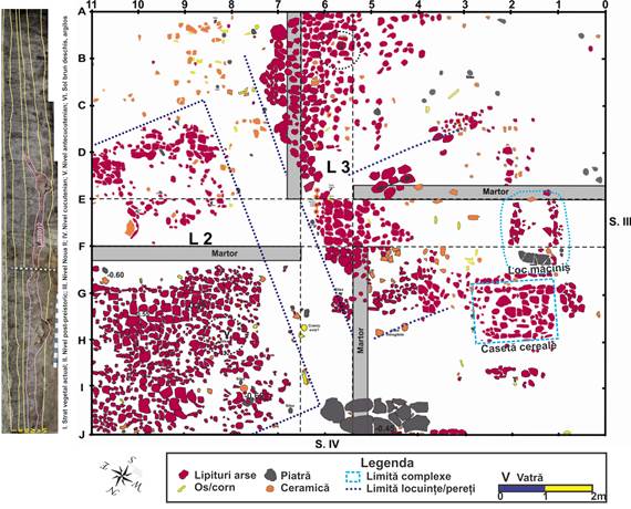 Cercetările arheologice din aşezarea de fază Cucuteni A-B de la Ripiceni-Holm, judeţul Botoşani, au debutat încă din anul 2010, când au fost efectuate primele evaluări de teren şi diagnostic arheologic, continuate ulterior şi în anul 2011, beneficiind de finanţarea Muzeului Judeţean Botoşani dar şi de sponsorizarea familiei Radu Miclescu de la Călineşti. Aşa cum am menţionat şi cu alte ocazii, staţiunea cucuteniană Ripiceni-Holm este amplasată în partea de NE a satului Ripicenii Noi, pe malul drept al Prutului (azi Lacul de acumulare Stânca-Costeşti), la 1200m SE de situl Ripiceni – Stânca şi 300 m SE de punctul Ripiceni-La Monument. Coordonate GPS: 47°57’18,60” N; 27°09’05.83” E (fig. 1). Situaţia geomorfologică actuală a zonei este mult modificată, datorită construirii barajului si a lacului de acumulare de la Stânca-Costeşti, în perioada anilor 1952-1978 (lacul – 59 km2, barajul – 3 km lungime, 44 m la coronament). Aşezarea se află pe terasa a II-a a Prutului (20-30 m altitudine relativă, aprox. 100 m altitudine absolută, cu soclu sarmaţian – 8-10 m grosime şi cuvertură de aluviuni – 3-15 m grosime), fiind amplasată pe un revers de cuestă, desprins din terasa a II-a, înclinat dinspre ESE spre VNV şi NNE către SSV. Întinderea actuală a sitului este de cca. 300m (pe direcţia ESE-VNV) şi 200 m (pe direcţia NNE-SSV). Latura de NNE este afectată de inundaţiile anuale, care au condus la distrugerea acestei părţi de sit. În acest moment, aşezarea cucuteniană de la Ripiceni-Holm este supusă în permanenţă unui proces de eroziune datorită apelor lacului de acumulare de la Stânca-Costeşti, pe malul căruia se află, fapt care duce la distrugerea sa continuă şi ireversibilă. În articolul de faţă, dorim să aducem în discuţie unele date obţinute ca urmare a recentelor săpături arheologice efectuate în această staţiune pe parcursul campaniei din 2012. Cercetările au fost posibile datorită semnarii unui protocol de colaborare ştiinţifică între Muzeul Judeţean Botoşani şi Facultatea de Istorie a Universităţii ,,Ştefan cel Mare” Suceava, în cadrul unui proiect mai amplu, întitulat ,,Evoluţia habitatului uman pre- şi protoistoric în Depresiunea Prutului mijlociu”. Colectivul ştiinţific al acestui şantier a fost format din: conf.univ.dr Dumitru BOGHIAN (Universitatea ,,Ştefan cel Mare” Suceava) şi dr. Aurel MELNICIUC (Muzeul Judeţean Botoşani). De asemenea, din colectivul de cercetare au mai făcut parte Sergiu Constantin Enea (Liceul Ion Neculce Târgu Frumos), Ioan Ignat (Şcoala Gimnazială Lozna), Măriuca-Diana Vornicu, Andreea Vornicu, Loredana Pricop, Alexandru Gafincu, Radu-Gabriel Furnică (Univ. ,,A.I. Cuza” Iaşi), Bogdan-Petru Niculică (Muzeul Bucovinei Suceava). Mulţumim de asemenea studenţilor: Marian Sergiu Ţifui, Dumitru-Ionuţ Stigleţ, Bogdan Mitică Viţelariu, Flavius Răzvan Derscariu, de la Universitatea din Suceava, care au participat la săpături, ca voluntari. Săpăturile din anul 2012 au avut ca obiectiv definirea stratigrafiei verticale şi orizontale a complexelor investigate, stabilirea apartenenţei cultural-cronologică şi distribuţia spaţială a materialelor arheologice, precum şi starea de conservare a patrimoniului, având în vedere gradul de distrugere al sitului, în vederea fundamentării proiectului de cercetare sistematică. În acest scop, de un real folos a fost realizarea în prealabil a unei scanări magnetometrice şi ridicări topografice (primăvara 2012), (fig.2), efectuate de către Felix Adrian Tencariu, Andrei Asăndulesei şi Silviu Gania de la Platforma Arheoinvest UAIC Iaşi, pentru evidenţierea dispunerii planimetrice a complexelor şi iniţierea cercetărilor sistematice. Pe baza datelor obţinute, am putut estima că situl a avut o suprafaţă de peste 6 hectare (330 x 200 m, pe direcţiile VNV-ESE şi NNE-SSV). Latura de NNE este puternic afectată de inundaţiile anuale, care au condus la ”ruinarea” acestei părţi de sit (circa 1/2 din suprafaţa acestuia), cea mai mare parte a complexelor şi materialelor arheologice fiind ”spălate” şi decontextualizate prin inundaşiile periodice. În acelaşi timp, scanarea magnetometrică a unei suprafeţe din zona de NE a sitului (140 x 60 m) a pus în evidenţă, cu multă acurateţe, prezenţa a 10 locuinţe şi anexe gospodăreşti cucuteniene arse, dispuse în anumite grupări, de-a lungul a două şiruri sau, poate, în cercuri concentrice (fig.2). Pentru verificarea în teren a validităţii investigaţiilor neintruzive, s-a trasat şi investigat parţial Cas. I/2012, cu dimensiunile 9 x 11 m, în partea cea mai înaltă a sitului, la 7,5 m SV de L.1/2010, trasată oarecum paralel cu S.II/2012, acolo unde scanarea magnetometrică arăta prezenţa a două locuinţe oarecum paralele (pe direcţia NV-SE), (fig.3). În suprafaţa săpată au fost descoperite două locuinţe: L.2 şi L.3/2012, numeroase complexe ceramice şi litice, confirmându-se datele oferite de scanarea magnetometrică. S-a observat că nivelul cucutenian este destul de consistent, fiind cuprins între –0.35/0.40 şi –0.80 m. L.2/2012 a fost descoperită în partea de NNE a Cas. I, continuându-se spre NE, în porţiunea nesăpată, ocupată de drumul de ţară care traversează situl. Avea o lungime de cca. 8 m şi o lăţime de cca. 5m, cu axului lung pe direcţia NV-SE. A fost parţial adâncită, având două camere, Podeaua prezenta porţiuni de platformă, care se aflau cu cca. 0,40 m mai jos decât nivelul cucutenian de călcare. Pereţii şi tavanul au fost realizate pe un schelet lemnos destul de masiv (în special ”blăni”/dulapi), lipiturile prezentându-se ca adevărate plăci, cu grosimea de 4-5 cm (fig.4). Nu excludem o eventuală etajare a acestei construcţii. În colţul de sud au fost identificate gropile unor stâlpi, ”plantaţi”, probabil, în şanţ