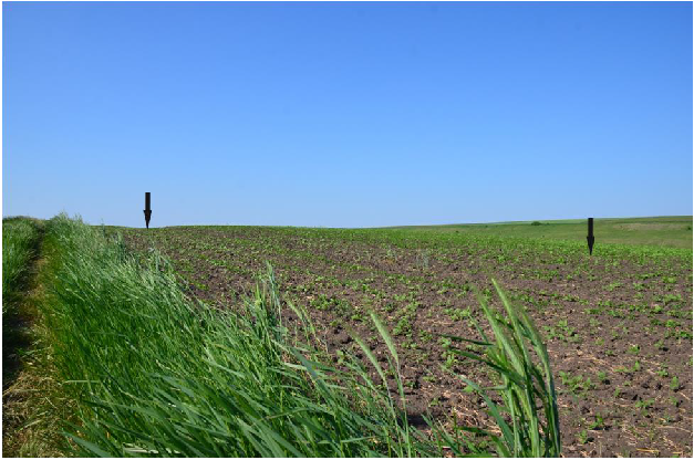 Foto nr. 2. Vedere dinspre sud spre cenușarul nr. 1 din punctul Oraș Ștefănești/Sat Cucuteni -Corogea cu delimitarea movilei cenușarului (Arhiva foto Neculai Bolohan).  În cercetarea de suprafață desfășurată în siturile menționate materialul arheologic vizibil la suprafața solului a fost colectat exhaustiv. În aceste condiții am reușit să realizăm primele observații privind cantitatea, calitatea, densitatea și fragmentaritatea materialelor pe o unitate de suprafață stabilită (foto 3). Cantitățile cele mai mari de artefacte au apărut în perimetrul cenușarelor, aici fiind descoperite fragmente osteologice și ceramice de dimensiuni mai mari, în timp ce spațiul aflat între cenușare a oferit o cantitate redusă de materiale, extrem de fragmentate. Diferențe privind conținutul artefactual, cantitatea și gradul de fragmentare au apărut și între materialele recuperate de pe suprafața fiecăruia dintre cenușare11.