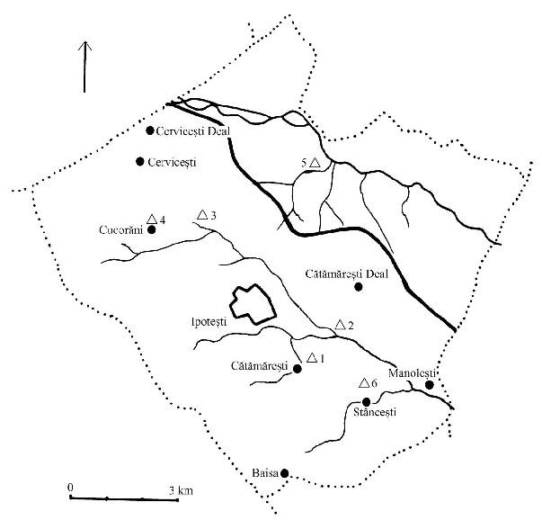 Fig. 1. Descoperiri aparținând culturii Sântana de Mureș pe teritoriul comunei Mihai Eminescu: 1. Cătămărești – La Salcâmii lui Cramă; 2. Cătămărești Deal - La Podul spre Brăiasca; 3. Cucorăni – Medeleni; 4. Cucorăni – Vatra Satului; 5. Cucorăni – La Șleahul Dorohoiului; 6. Stâncești – La Ciocan.