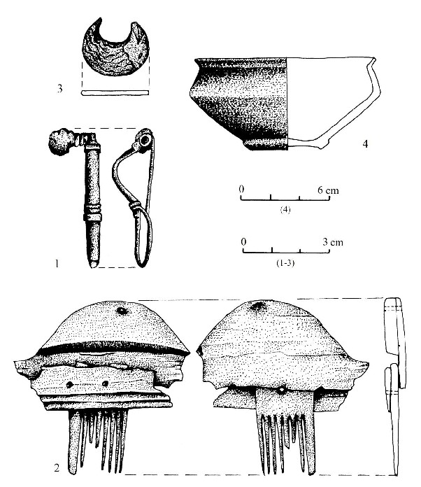 Pl. IV. Vorniceni, Pod lbăneasa ,cultura Cucuteni 1-4- paturi miniaturale. O necropolă de tip Sântana de Mureș descoperită la Cucorăni (com. MihaiEminescu, jud. Botoșani)*Ion Ioniță, Octavian Liviu Șovan Schlüsselwörter: Cucorăni; Grabfunde; Sântana-de-Mureș-Kultur În anul 1960, la Muzeul Județean Suceava1 au ajuns următoarele patru obiecte descoperite în localitatea Cucorăni (com. Mihai Eminescu, jud. Botoșani), toate atribuite culturii Sântana de Mureș din secolul al IV-lea d. Hr.: 1. Fibulă de bronz cu piciorul înfășurat, având corpul lucrat dintr-o bandă lată de circa 5 mm. Din resort s-a păstrat doar o jumătate, aflată de o parte a corpului, împreună cu acul fibulei. După cât s-ar părea, resortul a fost lucrat dintr-o singură bucată de sârmă (fig. 2, 1). L 4,6 cm. Inv. D / 1392. 2. Patru fragmente dintr-un pieptene de os, alcătuit din trei rânduri de plăcuțe prinse cu nituri de bronz; trei din cele patru plăcuțe se păstrează doar parțial (fig. 2, 2). Mânerul este aproximativ semicircular și cu aripi laterale, despre forma cărora nu se poate preciza nici un detaliu, întrucât cea mai mare parte a lor lipsește. Plăcuțele exterioare au fost lucrate dintr-o singură bucată. Una din ele, din care a mai rămas doar un fragment de la baza mânerului, are două caneluri largi foarte puțin adâncite la marginea de jos. Cea de a doua plăcuță exterioară se păstrează pe o zonă ceva mai mare, din ea *.Studiul a apărut și în Acta Musei Tutovensis. Istorie veche și arheologie, XI, Bârlad 2015, p. 161-166. 1 Denumirea de la acea dată a Muzeului Bucovinei din Suceava. 2 Autorii aduc mulțumiri colegiale domnului Bogdan Petru Niculică, muzeograf arheolog la Muzeul Bucovinei, care a oferit toate datele necesare asupra pieselor descoperite la Cucorăni (fotografii, dimensiuni și numere de inventar). De asemenea, sincere mulțumiri sunt adresate și doamnei desenatoare Lăcrămioara Duțuc de la același muzeu, care a realizat desenele celor patru obiecte. lipsind marginea de la bază și cele două aripioare. Din rândul de mijloc de plăcuțe se păstrează numai două. Prima din ele, mai groasă și păstrată în întregime, având forma unui segment de cerc, provine de la partea superioară a mânerului. Cea de a doua plăcuță, de formă aproximativ rectangulară (2x3,8 cm), reprezintă un segment din dantura pieptenelui, asamblat pe una din marginile laterale ale acestuia. Pe un capăt îngust ale plăcuței (20 mm) au fost tăiați dinții. Mai întâi, pe o latură a fost separată o zonă mai lată din plăcuță (4 mm sus și 3 mm jos, către vârful dinților), care avea menirea de a consolida și proteja întreaga dantură a pieptenelui, alcătuită din dinți mult mai subțiri (șapte dinți pe o lățime de numai 16 mm) și de aceea mai supuși deteriorării. Reconstituirea și reasamblarea pieptenelui de os din fragmentele componente ajunse la Suceava este foarte veche. În luna mai 1962, când primul semnatar al acestei note a văzut obiectele la Muzeul din Suceava, cele patru plăcuțe ale pieptănului erau asamblate eronat, așa cum se văd și acum în fig. 2, 2. Grigore Foit, directorul de atunci al Muzeului, care urma să pregătească o notă pentru tipar cu obiectele de la Cucorăni, a luat la cunoștință cum trebuie asamblată plăcuța cu dinți la pieptene, dar ulterior intervenția nu a mai fost făcută și piesa a rămas în aceeași stare până acum3. L 6 cm. Inv. D / 138. 3 Lipsa unei intervenții ulterioare asupra modului de asamblare a pieptănului s-a datorat, probabil, faptului că la foarte scurt timp, tot în anul 1962, Gr. Foit a fost schimbat din direcția Muzeului. El a revenit ca director în anul 1967, dar preocupările lui în această perioadă s-au concentrat asupra descoperirilor aparținând dacilor liberi de la Șcheia (așezare) și Suceava (necropolă). 3. Pandantiv de bronz în formă de luniță (fig. 2, 3). D 2,2 cm. Inv. D / 140. 4. Castron din pastă fină cenușie lucrat la roată. El are forma bitronconică, fundul inelar ușor profilat, diametrul maxim la mijlocul înălțimii, marginea subțiată evazată și semne evidente de ardere secundară pe o mare porțiune (fig. 2, 4). D 13 cm. Inv. D / 137. Gr. Foit nu deținea nici un fel de informații referitoare la locul și condițiile de descoperire ale celor patru obiecte de la Cucorăni. * * * Introducerea obiectelor de la Cucorăni în registrul inventar, cel din care s-au preluat și numerele menționate mai sus la fiecare piesă (de la D 137 până la D 140), s-a făcut în anul 1976. Nu cunoaștem dacă aceasta a fost prima inventariere a pieselor ajunse în anul 1960 la Suceava sau dacă operația respectivă a reprezentat de fapt o reinventariere, după un registru inventar mai vechi, care eventual ar fi putut conține și unele date suplimentare despre locul și condițiile de descoperire, ce nu au mai fost preluate și în registrul nou. Primele informații referitoare la descoperirile de la Cucorăni au fost aduse la cunoștința specialiștilor de Gh. Diaconu. În tentativa de a stabili apartenența culturală și etnică a mormintelor de incinerație cu urne arse secundar din cultura Sântana de Mureș, mai ales prin prisma descoperirilor din necropolele de la Olteni și Târgșor din Muntenia, el menționa pentru prima dată și noile descoperiri de la Cucorăni. Astfel, în două lucrări apărute în 1961, Gh. Diaconu menționează castronul ars secundar de la Cucorăni, afirmând că acesta fusese folosit ca urnă. De asemenea, el mai face și precizarea că celelalte trei obiecte (fibulă și pandantiv-luniță de bronz și pieptene de os) ar fi fost găsite în interiorul urnei4. 4 Gh. Diaconu, Probleme ale culturii Sântana- Cerneahov pe teritoriul R.P.R. în lumina cercetărilor din necropola de la Târgșor, în SCIV, XII, 2, 1961, p. 286; idem, K voprosu o kulʼture Syntana-Černjachov na territo